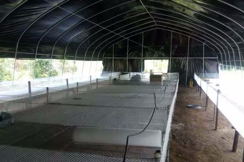 本大棚熱鍍鋅鋼管骨架,采用厚度15絲的黑白膜覆蓋,有效阻止光線進入大棚,兩側(cè)卷膜通風,適用于菌菇種植。
