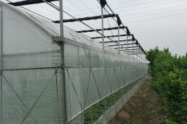 該產品由基礎、框架立柱,頂部拱管三大部分組成。點式獨立基礎,使大棚根基牢固;立柱采用熱鍍鋅方管,大大增強抗風抗雪強度;頂部由熱浸鍍鋅鋼管排列成平滑圓弧形,牢固兼美觀。同時天溝采用2mm厚熱鍍鋅板冷彎成型,容量大,排水及時;頂部天溝處和大棚四周均設置搖膜通風系統,是大棚內部氣流通暢。此產品可根據需要實現相關配套設施,以便達到更理想的效果,如外遮陽系統、內遮陽保溫系統、降溫系統、加溫系統、噴滴灌系統等。